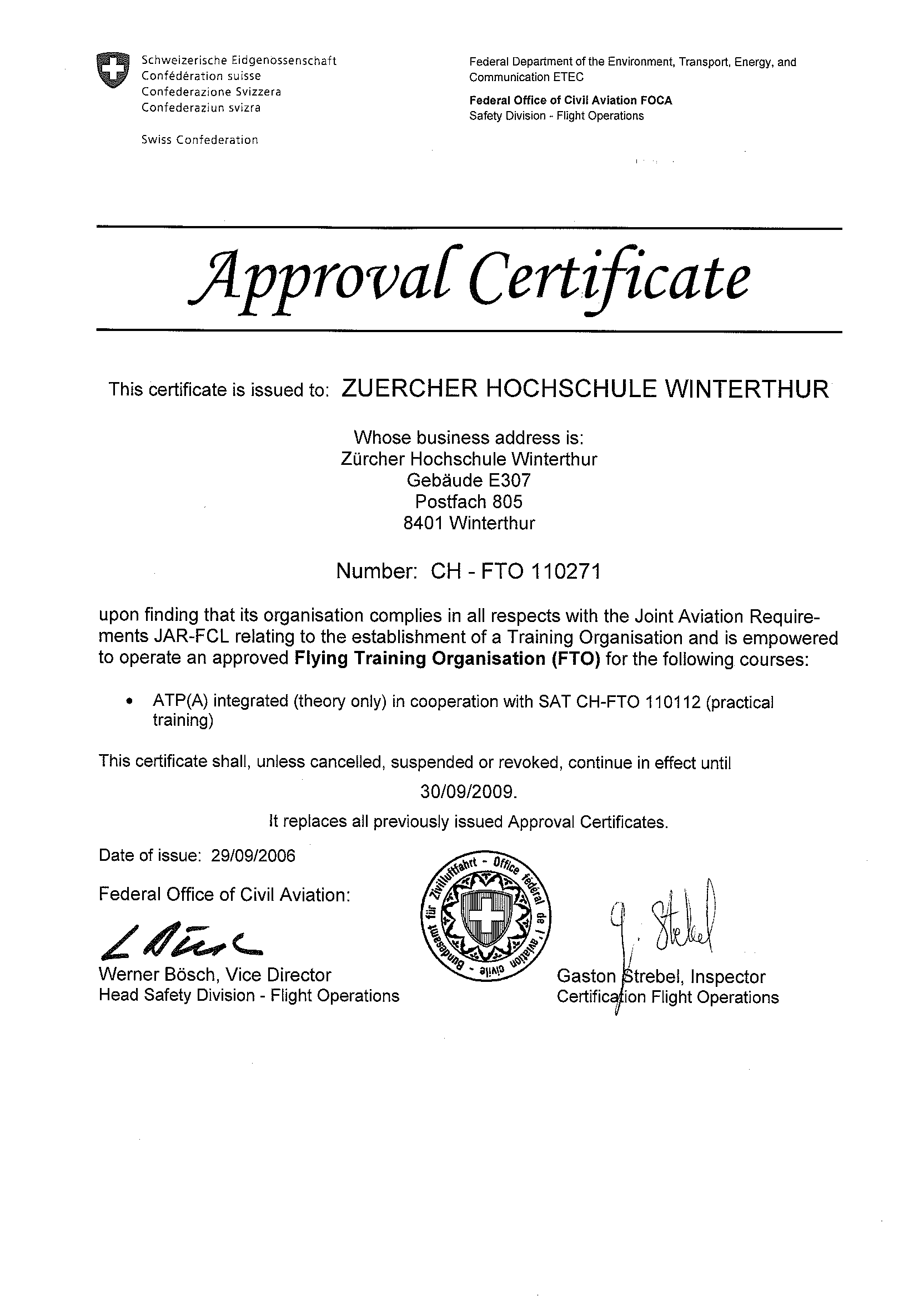 Interessierte Absolvierende des neuen Bachelor Studiengangs Aviatik an der ZHW werden jetzt auch die Möglichkeit haben, die theoretische Verkehrspiloten-Prüfung beim BAZL abzulegen. Die diesbezügliche Bewilligung wurde am 28.September 2006 durch das BAZL erteilt.